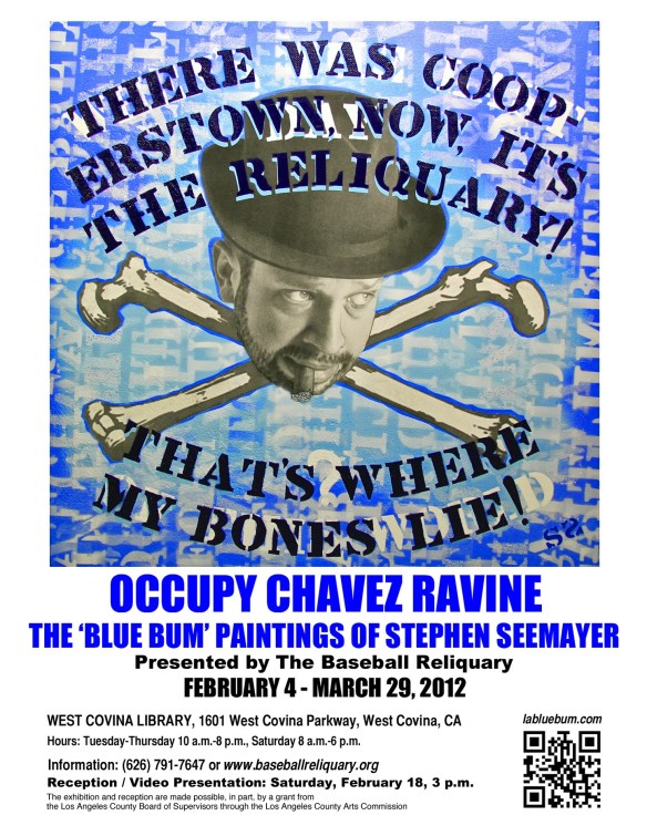 The Baseball Reliquary launches its 2012 season by presenting an exhibition, Occupy Chavez Ravine: The “Blue Bum” Paintings of Stephen Seemayer, from February 4-March 29, 2012 at the West Covina Library, 1601 West Covina Parkway, West Covina, California.