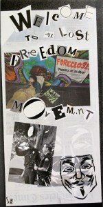 In addition to the collages, made up of reconstructed L.A. Times front pages, newspaper and magazine clippings, photographs and spray paint, the exhibit features a 5-minute movie about the occupation of City Hall in the fall of 2011. The film includes photographs and video that he and his wife, filmmaker Pamela Wilson, took over the two months of the protest, and from the last night, when the peaceful demonstrators were forcefully evicted by the LAPD.